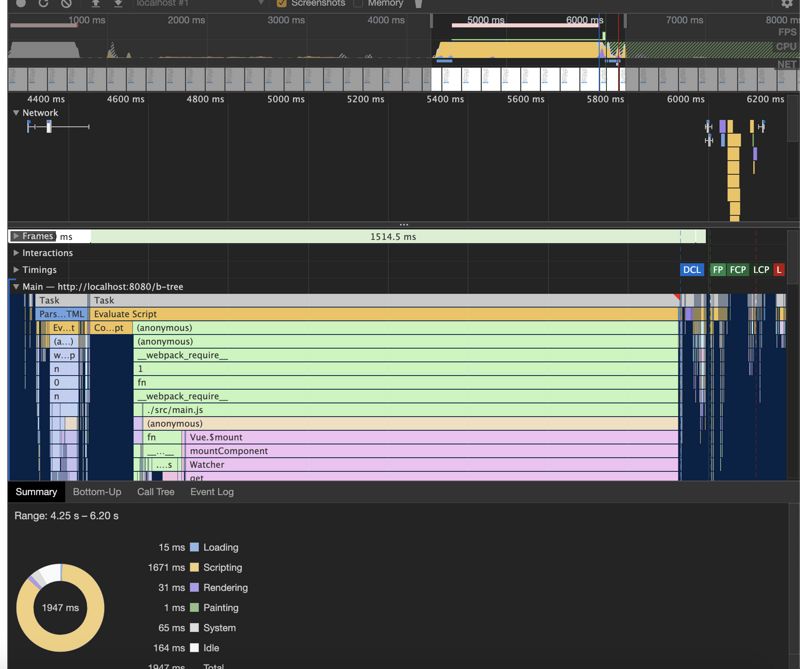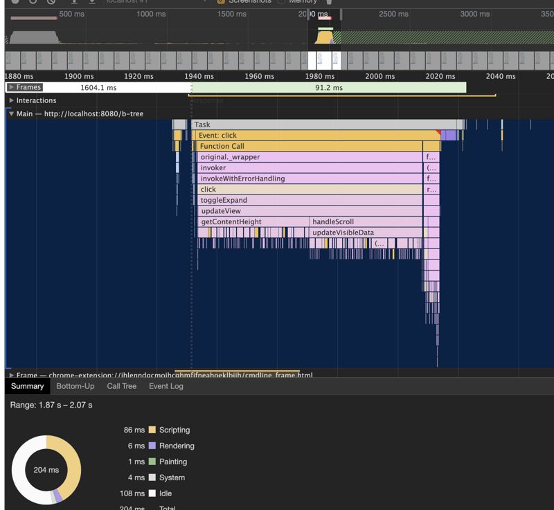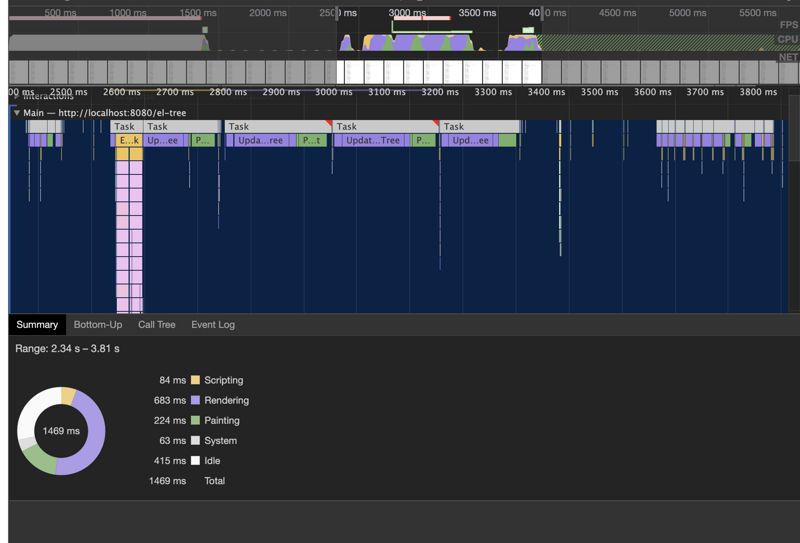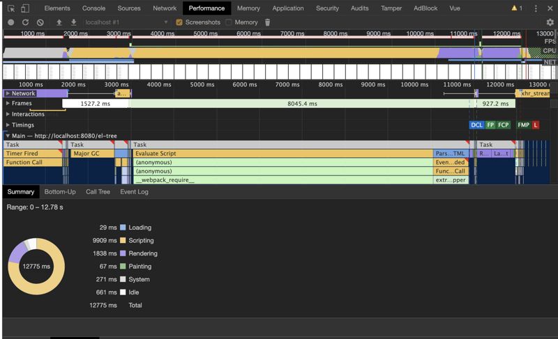 项目中需要渲染一个5000+节点的树组件,但是在引入element Tree组件之后发现性能非常差,无论是滚动、展开/收起节点还是点击节点卡顿都非常明显,利用performance跑一下性能数据发现到问题所在