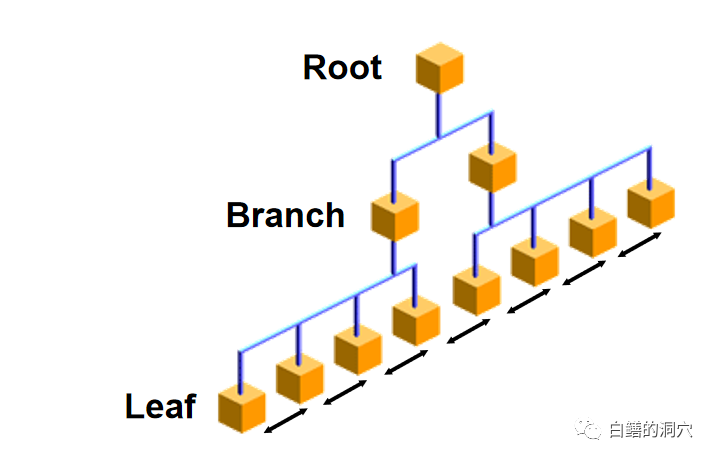 上面这张图来自于首发B+树的那篇论文。分支节点只做索引,只有叶节点存储数据。索引键左侧的块都小于索引键值,右侧的都大于索引键值。今天老白以Oracle的B树索引为例,来分析一下索引的结构。实际上在老白的《DBA的思想天空》中就讨论过索引的结构,B树索引是一棵带双向叶节点链的B+树,如下图: