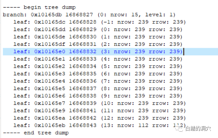 我们可以用一个实际的例子来看一棵索引树的结构(老白创建了一个索引,然后用treedump事件把索引的结构DUMP出来)