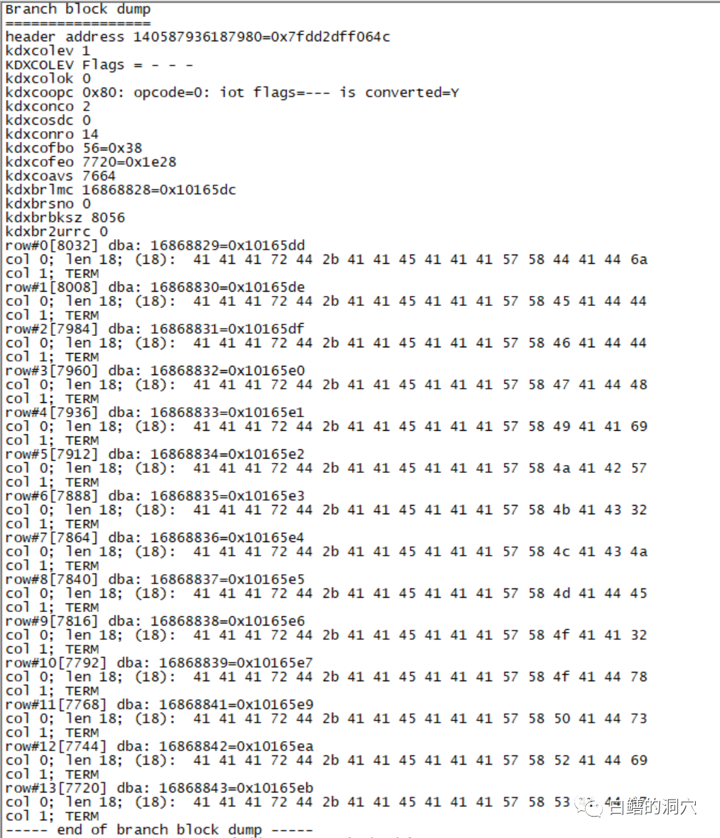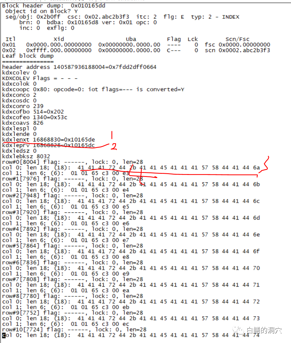 大家注意3的位置就是键值,COL0,4的位置COL1就是该键值对应的数据表的ROWID,通过这个ROW就可以找到这条记录了。大家注意下1和2,这就是叶节点双向链表。大家可以看到,kdxlenxt是下一个叶节点,而Kdxleprv是前一个叶节点。具体大家可以对照图2的数据。叶节点链使扫描变得更为高效。只要找到第一条符合条件的记录,如果使>=操作,就顺着叶节点链往高查找,直到不满足条件为止。如果使<操作,那么就从该值开始找到第一个小于该条件的记录,然后向下扫描,直到所有符合条件的记录被找到就行了。