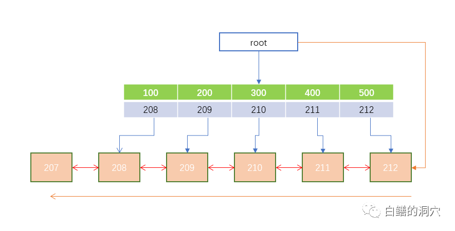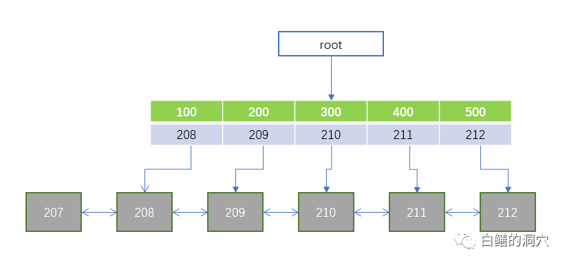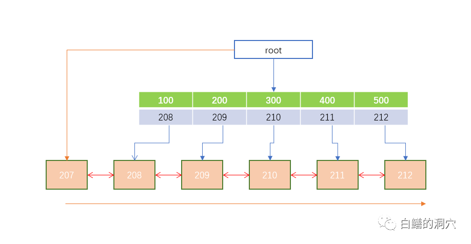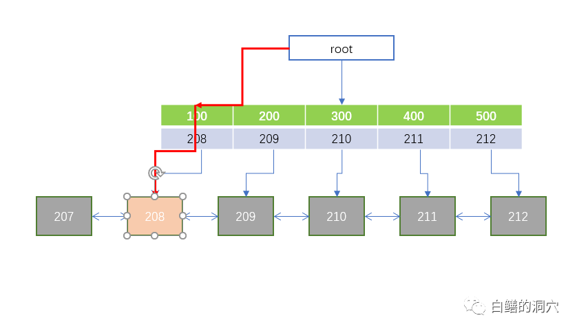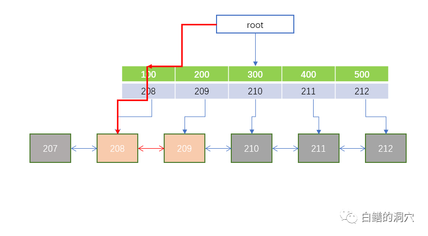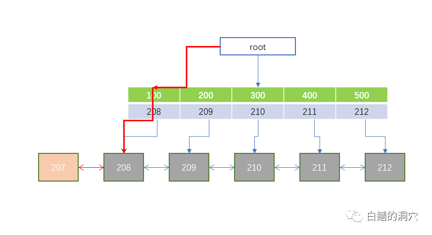 这是一个一级枝节点,一级叶节点的索引。id>=100的数据指向208,200的指向209,以此类推。这里有一个207块,就是-1号节点,存储小于100的数据。我们来看看索引是如何工作的。select ... from ... where id=100