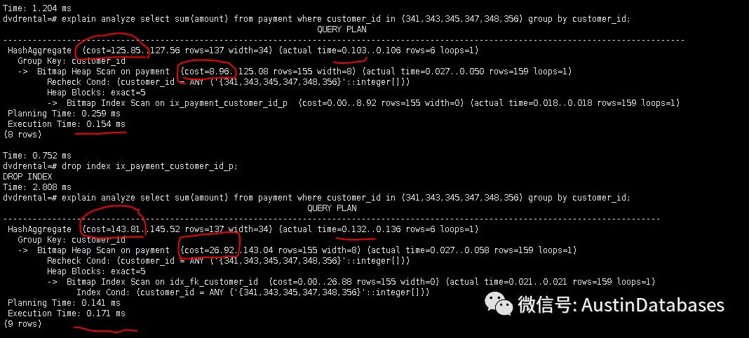 下面第一个是建立了 partical index 从图中看,对比删除了 partical index 使用正常的索引来看,在 cost 和 时间上均有一些变化,partical 使用的时间和COST 要小于 index 整体。