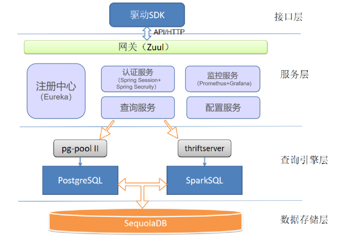 为了在不同的查询场景能够提供最优的查询效率,提供了两种查询引擎:PostgreSQL、SparkSQL,这两种引擎通过与 SequoiaDB 对接实现 SQL 的解析与计算,只存储表的元数据信息,实际数据内容存储于 SequoiaDB。