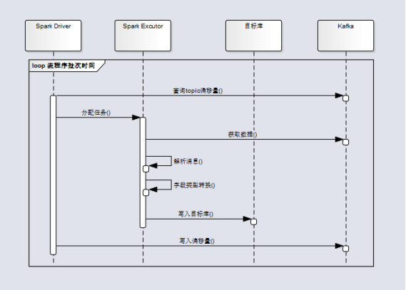 1. SparkStreaning 引擎根据配置的批处理间隔,Driver 进程周期性的查询Kafka对应topic的偏移量,如果有新的数据到达,Driver 将消息的分区和偏移量信息传递给各Excutor进程,Excutor 进程拉取对应的数据。