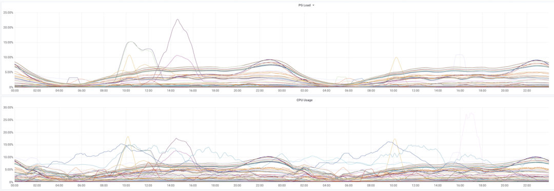PG Load的利用率目标有一些经验值:黄线通常为50%,即需要引起关注的阈值;红线通常为70%,即报警线,需要立刻采取行动的阈值;500%或更高通常意味着这个实例已经被打崩了。