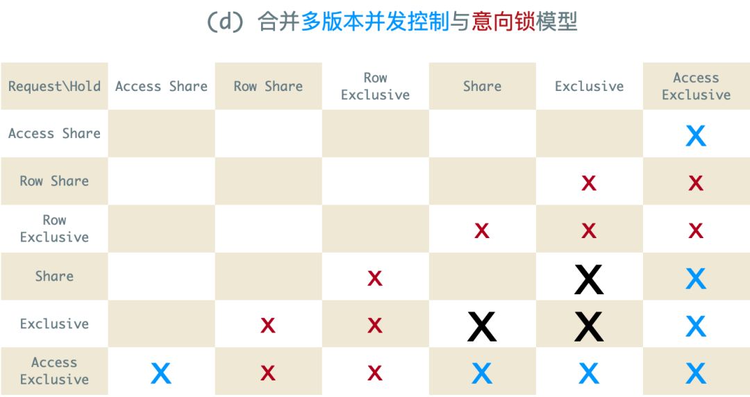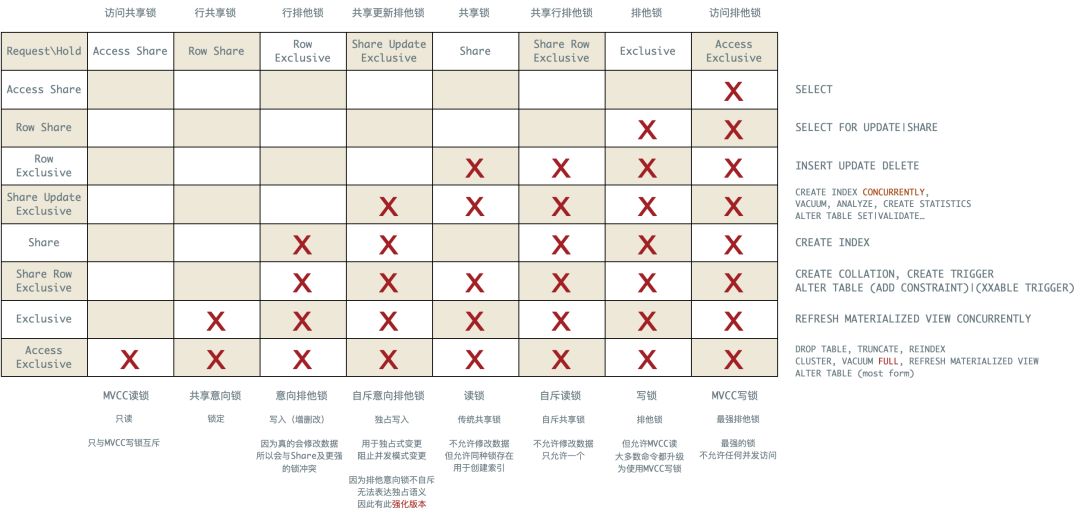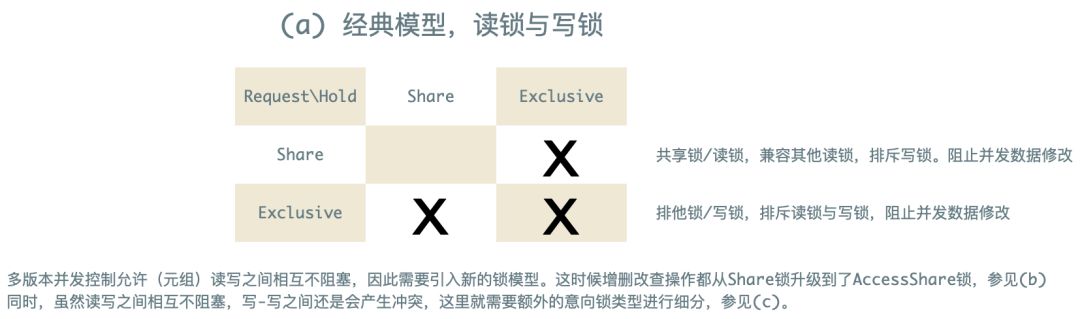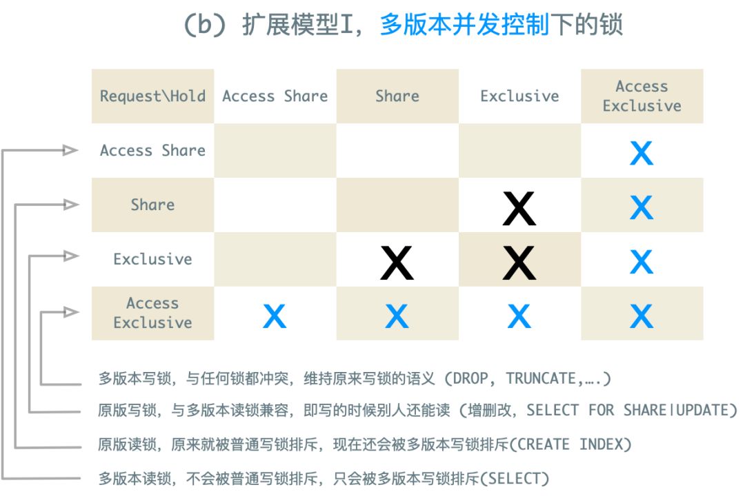 因此,引入两种自斥版本的锁后,就是PostgreSQL中的最终表级锁模型,如图(e)所示。