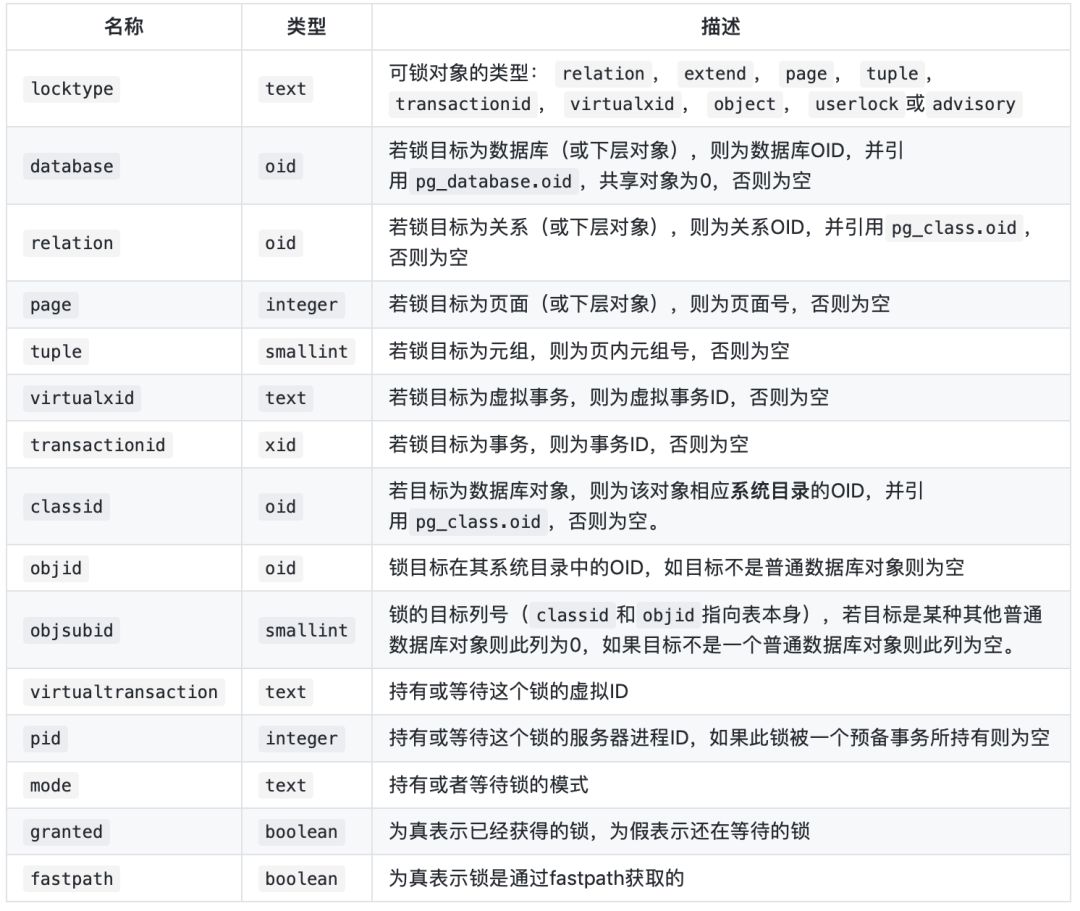 的锁是从常规锁管理器中获取的,同时谓词锁管理器中的数据也是单独获取的,因此这几种来源的数据之间可能并不一致。频繁访问本视图会对数据库系统性能产生影响,因为要对锁管理器加锁获取一致性快照。