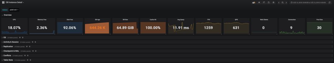 为了帮助读者形成一种直觉,这里展示了在实际环境中,我所使用的监控面板。最为常用的监控面板为“单数据库实例”监控,并分为7个主要的子区域:概览,操作系统,数据库活动与会话,复制,检查点与WAL,数据库冲突,以及数据库对象统计,如下所示。