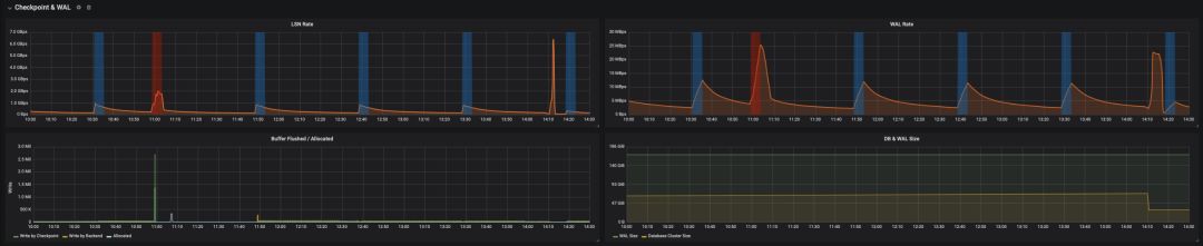 打开的情况下,每一次检查点都会导致其后的WAL量升高,吃磁盘与网络的带宽。在一些情况下可能会成为故障的原因。因此有必要监控检查点与WAL,相关指标包括: