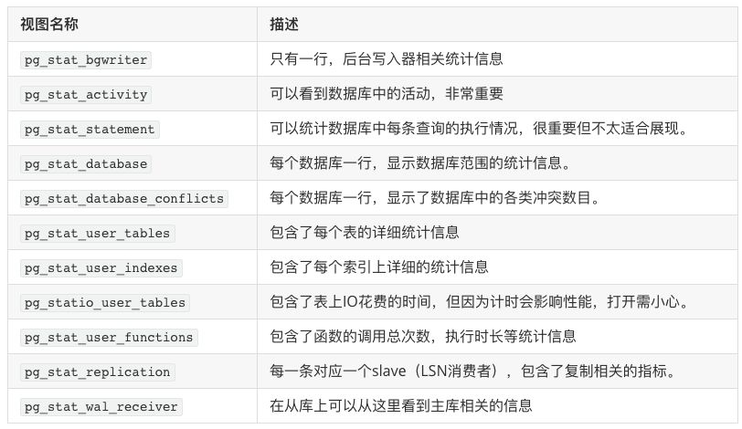 对于PostgreSQL而言,其监控指标主要源于自带的统计收集器。PostgreSQL提供了很多系统视图,因此能很简单地以SQL语句的形式拉取统计数据。系统视图的具体定义可以参考文档,后续文章也会依此详细介绍。其中,比较重要的视图包括: