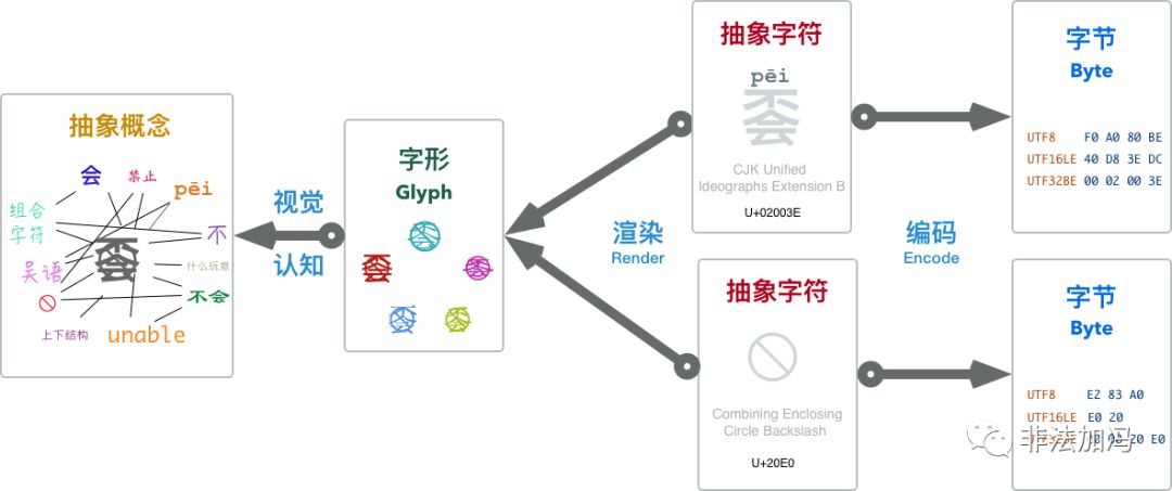 抽象字符是一种抽象的符号,与具体的形式无关:区分字符(character)与字形(Glyph)是非常重要的,我们在屏幕上看到的有形的东西是字形(Glyph),它是抽象字符的视觉表示形式。抽象字符通过渲染(Render)呈现为字形,用户界面呈现的字形通过人眼被感知,通过人脑被认知,最终又在人的大脑中还原为抽象的实体概念。字形在这个过程中起到了媒介的作用,但决不能将其等价为抽象字符本身。