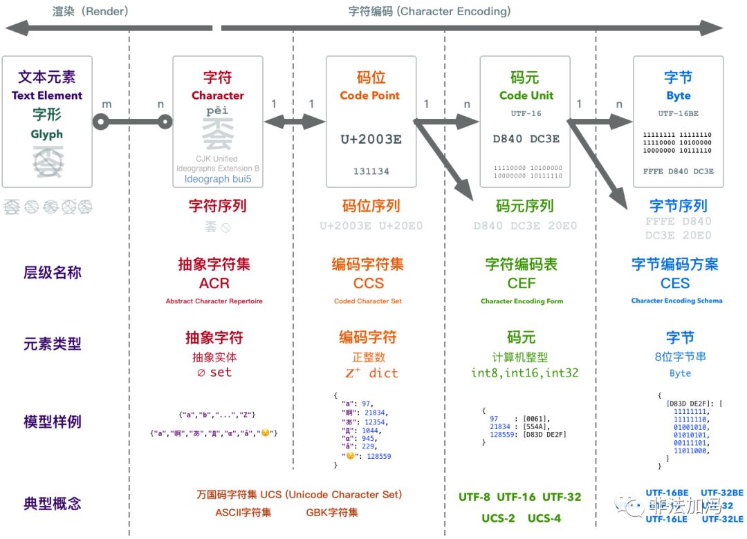可以看到,为了将一个抽象字符转换为二进制,中间其实经过了几次概念的转换。在抽象字符序列与字节序列间还有两种中间形态:码位序列与码元序列。简单来说: