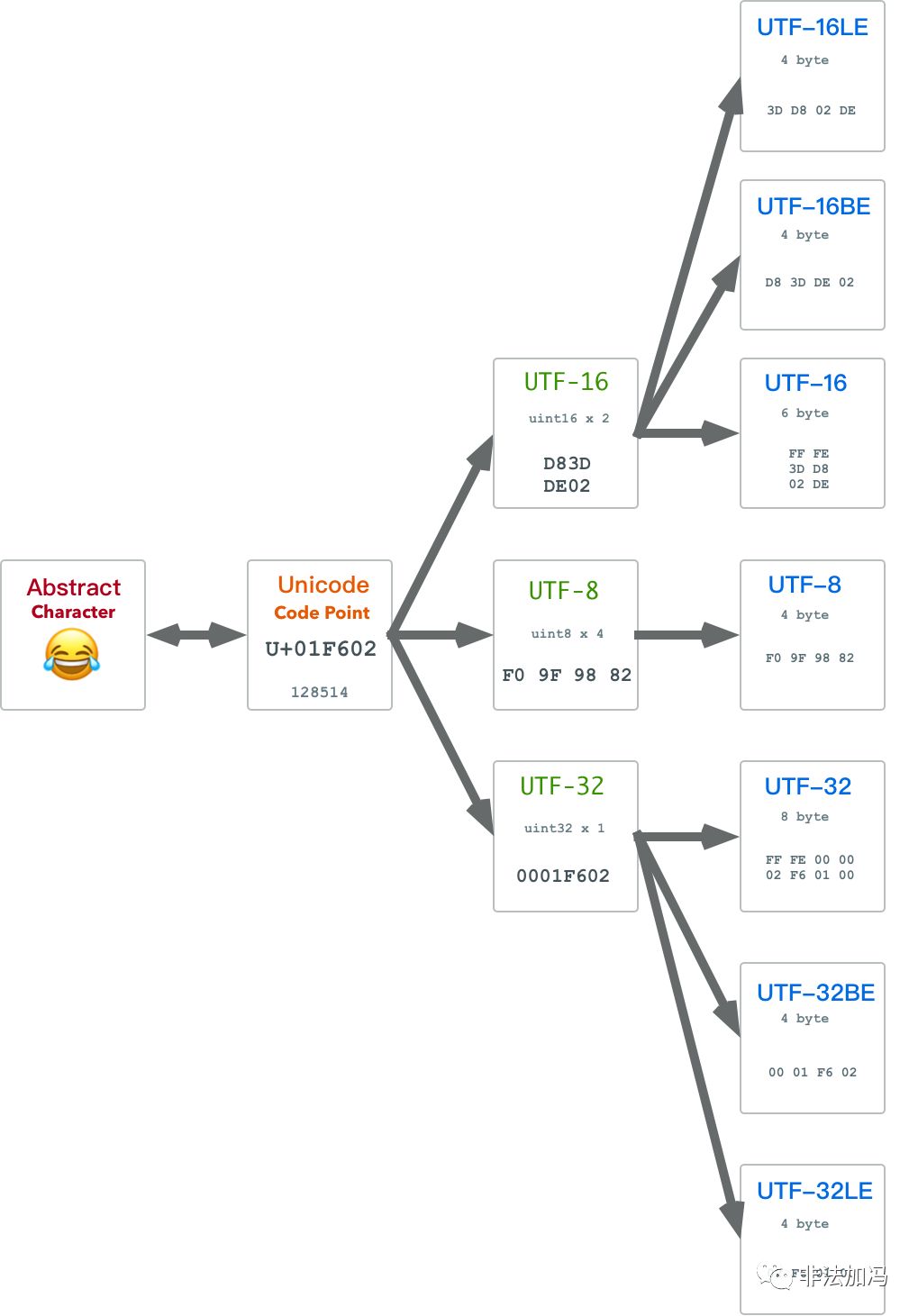 当然要注意,在当前上下文中的UTF-8,UTF-16,UTF-32其实是CES层次的概念,即带有字节序列化方案的CEF,这会与CEF层次的同名概念产生混淆。因此,当我们在说UTF-8,UTF-16,UTF-32时,一定要注意区分它是CEF还是CES。例如,作为一种编码方案的UTF-16产生的字节序列是会带有BOM的,而作为一种编码表的UTF-16产生的码元序列则是没有BOM这个概念的。