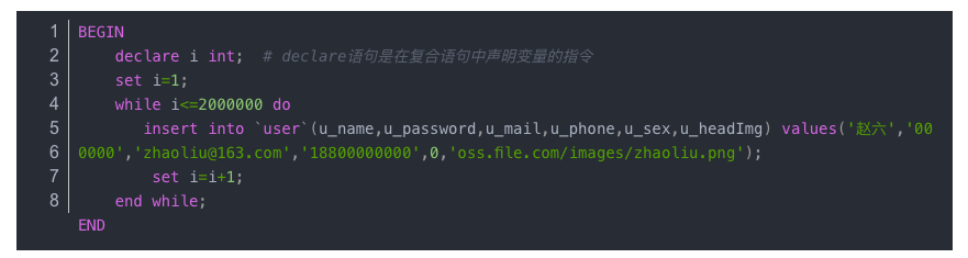 我在数据表中添加了100w张三、100w李四、100w王五、200赵六的用户,所以表中一共500w数据,添加数据的方式采用的存储过程。