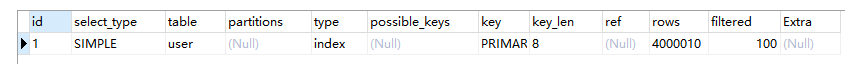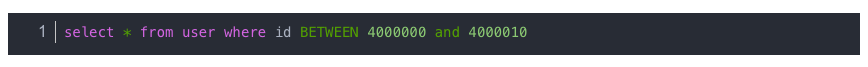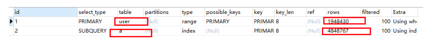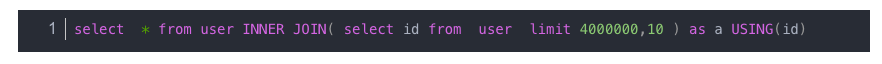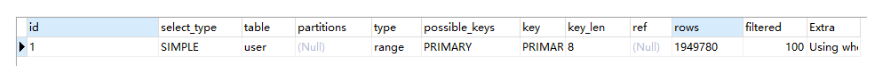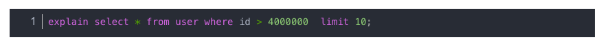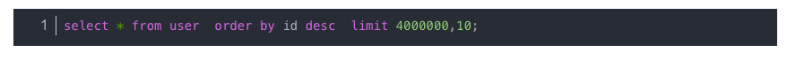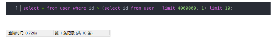 我们看到rows=1949780,这个表示可能扫描了这么多行,这个行数是因为扫描id>400w的记录,后面还有两百万,而这里表示可能扫描了1949780行,但是由于limit 10的存在,所以扫描了10行之后就停止扫描了,我们也可以对比一下使用这种方式和直接使用limit 4000000,10的效率,千差万别。但是这种比较局限,只能适用于自增组件,那个uuid生成的主键这种方式不适用。