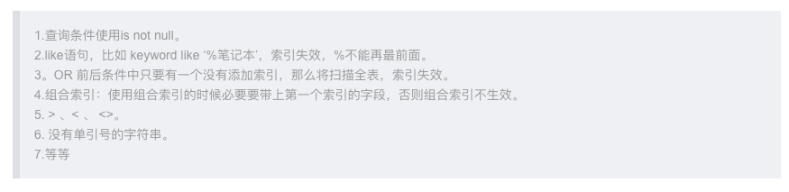 这一点相信大家都知道,添加索引可以提高查询效率,如何我们的分页查询牵扯到条件的话,我们可以给条件添加索引,数据库会维护一张对应的索引表,查询的时候会先查询索引表,根据索引表返回的记录直接查询记录表,这样也减少了扫描的行数,但是需要注意,只要发生一下几点,索引都有可能不会被触发,一定要注意。