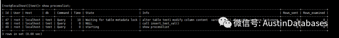 而在kill 掉所有的有关线程后,再次做这个实验,惊奇的是不在有MDL LOCK 来阻碍 alter 的操作,基本上都是瞬间在0.几秒的时间就完成了。