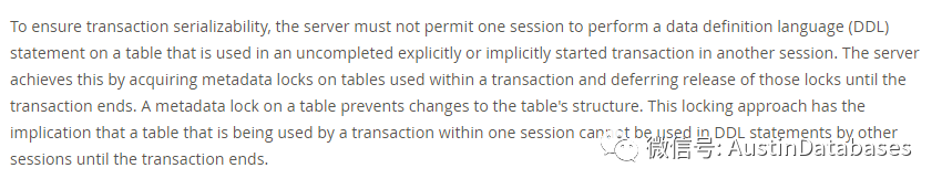 为了确保事务的可串行性,服务器必须不允许一个会话对另一个会话中未完成的显式或隐式启动的事务中使用的表执行数据定义语言(DDL)语句。服务器通过获取事务中使用的表的元数据锁,并将这些锁的释放推迟到事务结束时,来实现这一点。表上的元数据锁可以防止对表结构的更改。这种锁定方法意味着一个会话内的事务正在使用的表,不能在DDL状态下使用。
