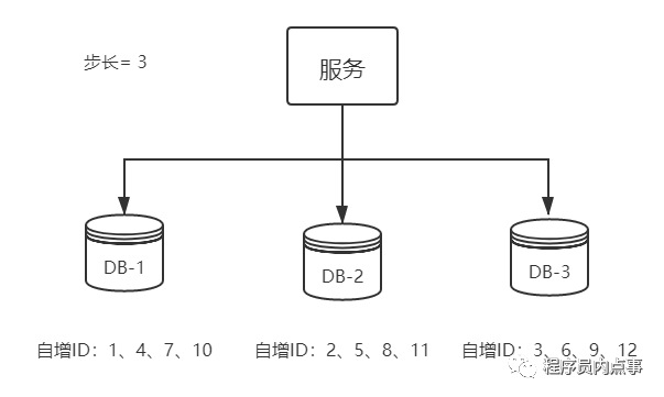 从上图可以看出,水平扩展的数据库集群,有利于解决数据库单点压力的问题,同时为了ID生成特性,将自增步长按照机器数量来设置。