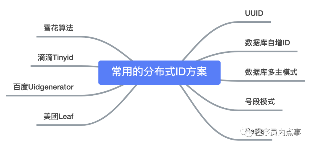 UUID 数据库自增ID 数据库多主模式 号段模式 Redis 雪花算法(SnowFlake) 滴滴出品(TinyID) 百度 (Uidgenerator) 美团(Leaf)