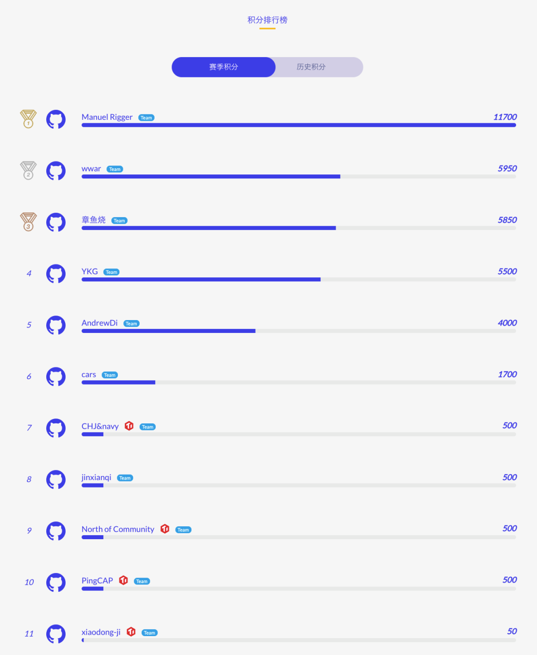 YKG,5500 分 AndrewDi,4000 分 cars,1700 分 CHJ&navy,500 分 jinxianqi,500 分 North of community,500 分 PingCAP,500 分 xiaodong-ji,50 分