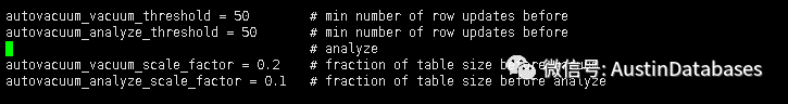 上面的公式就是表在插入,更新,删除后会被选入到autovacuum中的方法。下面的参数们就是触发分析或进行autovacuum的选择项