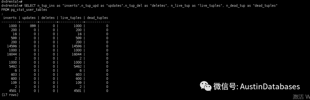 SELECT n_tup_ins as "inserts",n_tup_upd as "updates",n_tup_del as "deletes", n_live_tup as "live_tuples", n_dead_tup as "dead_tuples"