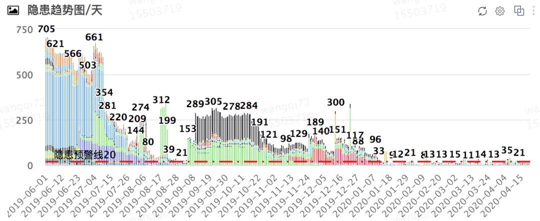 下面的隐患趋势图,展示了近一年中隐患的个数,数量突然增长是由于新的巡检项上线。从整体趋势上看,隐患存量有非常明显的下降。