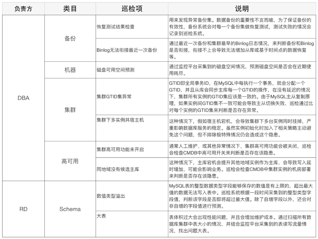 巡检目标:除了对生产数据库进行巡检以外,还会对高可用组件、中间件等数据库周边产品进行巡检,尽可能覆盖所有会引发数据库故障的风险点。