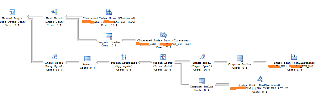 排除那些复杂的 Index Spool,Stream Aggregation,这里面最吸引我的是同一张表,居然要扫描两次,就是那张 XXX_PER表。所以我不得不重新看下这段SQL的逻辑,简直是鬼才!