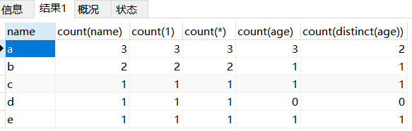 create table counttest(name char(1),age char(2)); insert into counttest values('a', '14'),('a', '15'),('a', '15'),('b', NULL),('b', '16'),('c', '17'),('d', null),('e', '');select name,count(name),count(1),count(*),count(age),count(distinct(age))from counttestgroup by name;