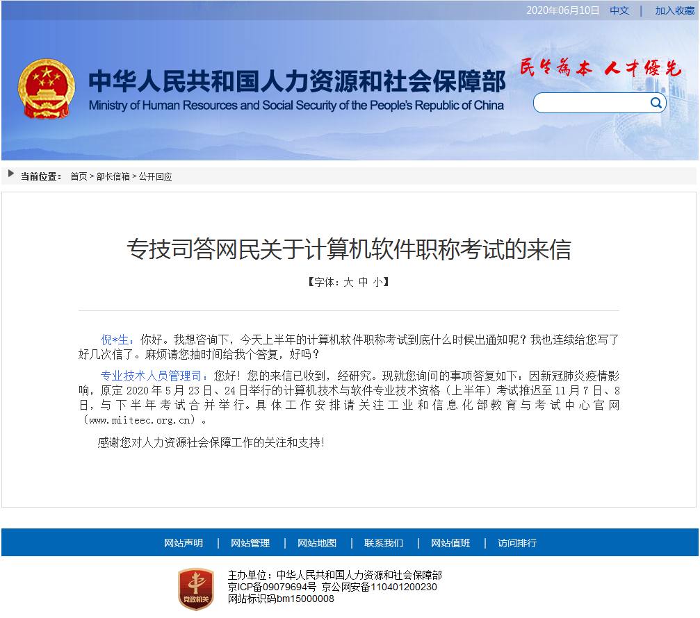 近日,有网友在中华人民共和国人力资源和社会保障部网站上的部长信箱里提问关于2020年上半年计算机技术与软件专业技术资格考试时间的问题,得到的回复是原定2020年5月23日、24日举行的计算机技术与软件专业技术资格(上半年)考试推迟至11月7日、8日,与下半年考试合并举行。具体回复内容如下: