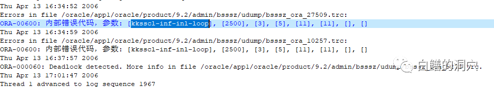 Errors in file/oracle/app1/oracle/product/9.2/admin/bsssz/udump/bsssz_ora_10892.trc: ORA-00600: 内部错误代码,参数: [kksscl-inf-inl-loop],[2500], [592], [603], [1211], [1211], [], [] Tue Apr 18 13:48:25 2006 Errors in file/oracle/app1/oracle/product/9.2/admin/bsssz/udump/bsssz_ora_8253.trc: ORA-00600: 内部错误代码,参数: [kksscl-inf-inl-loop],[2500], [424], [454], [909], [909], [], [] |