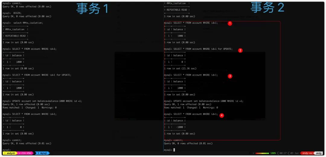 注意事务 2,③处查询到 id=1,balance=1000,但是实际上由于此时事务 1 已经提交,最新结果如②处所示 id=1,balance=900。