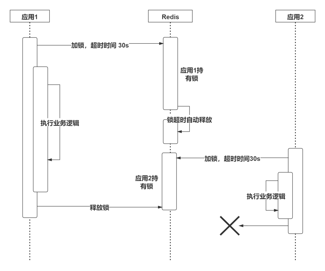 假设应用 1 加锁成功,锁超时时间为 30s。由于应用 1 业务逻辑执行时间过长,30 s 之后,锁过期自动释放。