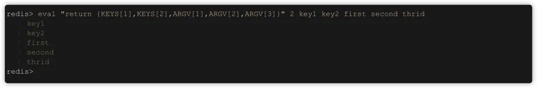 eval "return {KEYS[1],KEYS[2],ARGV[1],ARGV[2],ARGV[3]}" 2 key1 key2 first second third