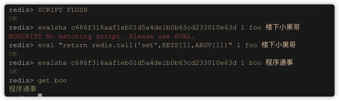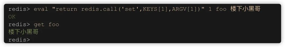 eval "return redis.call('set',KEYS[1],ARGV[1])" 1 foo 楼下小黑哥