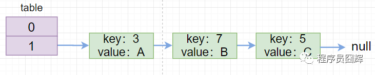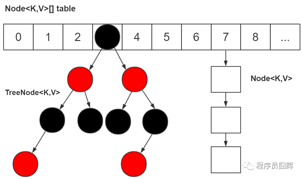 囧辉:我们现在用的都是 JDK 1.8,底层是由“数组+链表+红黑树”组成,如下图,而在 JDK 1.8 之前是由“数组+链表”组成。