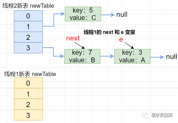 3)线程1被挂起后,线程2进入扩容流程,并走完整个扩容流程,此时的结构如下图。