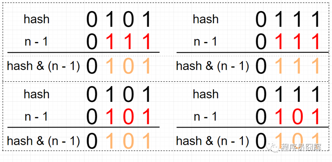 例如下图,如果不加入高位运算,由于 n - 1 是 0000 0111,所以结果只取决于 hash 值的低3位,无论高位怎么变化,结果都是一样的。