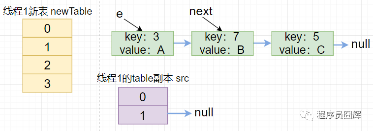 2)线程1进行扩容,执行到代码:Entry<K,V> next = e.next 后被调度挂起,此时的结构如下图。