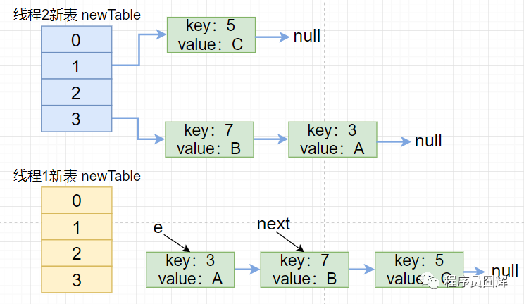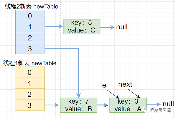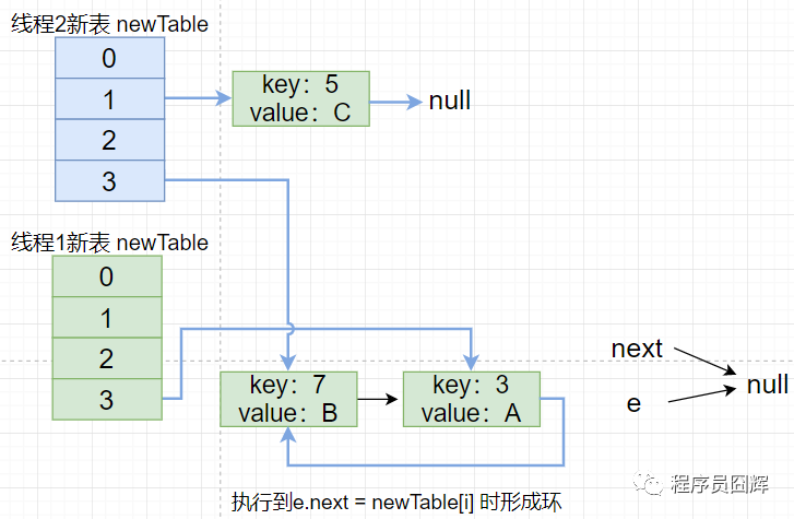 6)线程1继续执行第三次循环,执行到 e.next = newTable[i] 时形成环,执行完第三次循环的结构如下图。