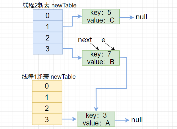 例子:我们有1个容量为2的 HashMap,loadFactor=0.75,此时线程1和线程2 同时往该 HashMap 插入一个数据,都触发了扩容流程,接着有以下流程。