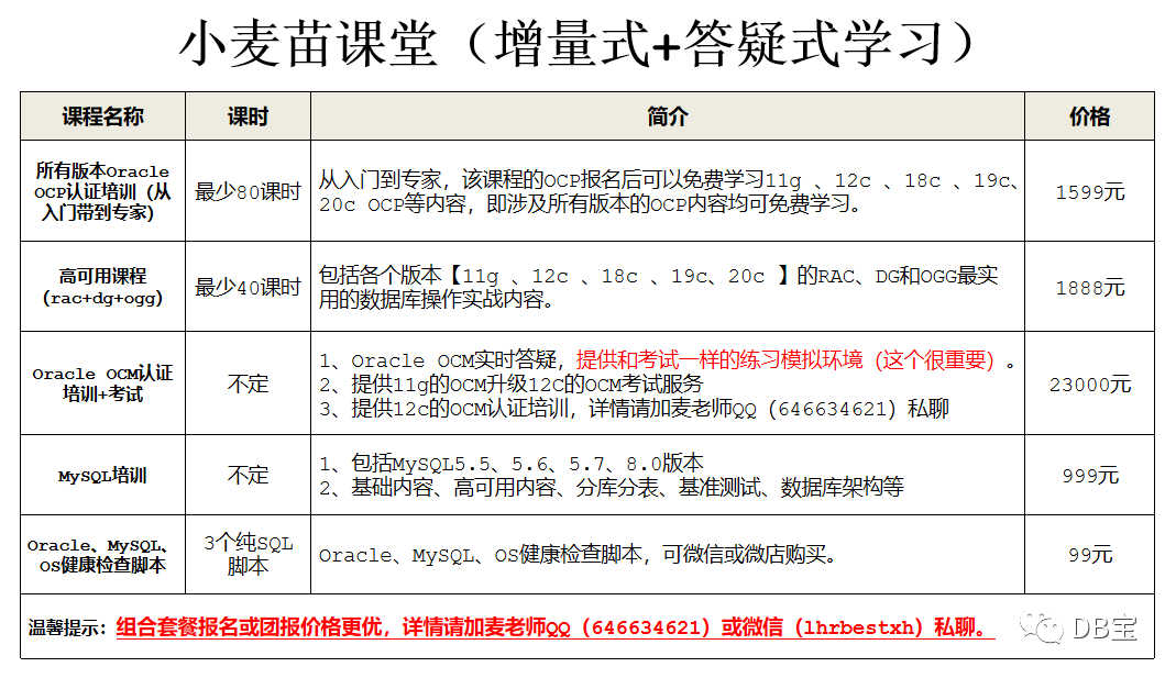 ==================================================================================================================【干货来了|小麦苗IT资料分享】★小麦苗DB职场干货:https://mp.weixin.qq.com/s/Vm5PqNcDcITkOr9cQg6T7w★小麦苗数据库健康检查:https://share.weiyun.com/5lb2U2M★小麦苗微店:https://weidian.com/?userid=793741433★各种操作系统下的数据库安装文件(Linux、Windows、AIX等):https://pan.baidu.com/s/1hqff3Evv6oj2-Tn87MpFkQ★小麦苗分享的资料:https://share.weiyun.com/57HUxNi★小麦苗课堂资料:https://share.weiyun.com/5fAdN5m★小麦苗课堂试听资料:https://share.weiyun.com/5HnQEuL★小麦苗出版的相关书籍:https://share.weiyun.com/5sQBQpY★小麦苗博客文章:https://share.weiyun.com/5ufi4Dx★数据库系列(Oracle、MySQL、NoSQL):https://share.weiyun.com/5n1u8gv★公开课录像文件:https://share.weiyun.com/5yd7ukG★其它常用软件分享:https://share.weiyun.com/53BlaHX★其它IT资料(OS、网络、存储等):https://share.weiyun.com/5Mn6ESi★Python资料:https://share.weiyun.com/5iuQ2Fn★已安装配置好的虚拟机:https://share.weiyun.com/5E8pxvT★小麦苗腾讯课堂:https://lhr.ke.qq.com/★小麦苗博客:http://blog.itpub.net/26736162/★OCP培训:https://mp.weixin.qq.com/s/2cymJ4xiBPtTaHu16HkiuA★12c的OCP培训:https://mp.weixin.qq.com/s/hMLHlyjMHhLmA0xN4hLvfw★OCM培训:https://mp.weixin.qq.com/s/7-R6Cz8RcJKduVv6YlAxJA★高可用(RAC+DG+OGG)培训:https://mp.weixin.qq.com/s/4vf042CnOdAD8zDyjUueiw★小麦苗课堂腾讯视频:http://v.qq.com/vplus/71f69a319a24c6808cd6e6189ae90664==================================================================================================================