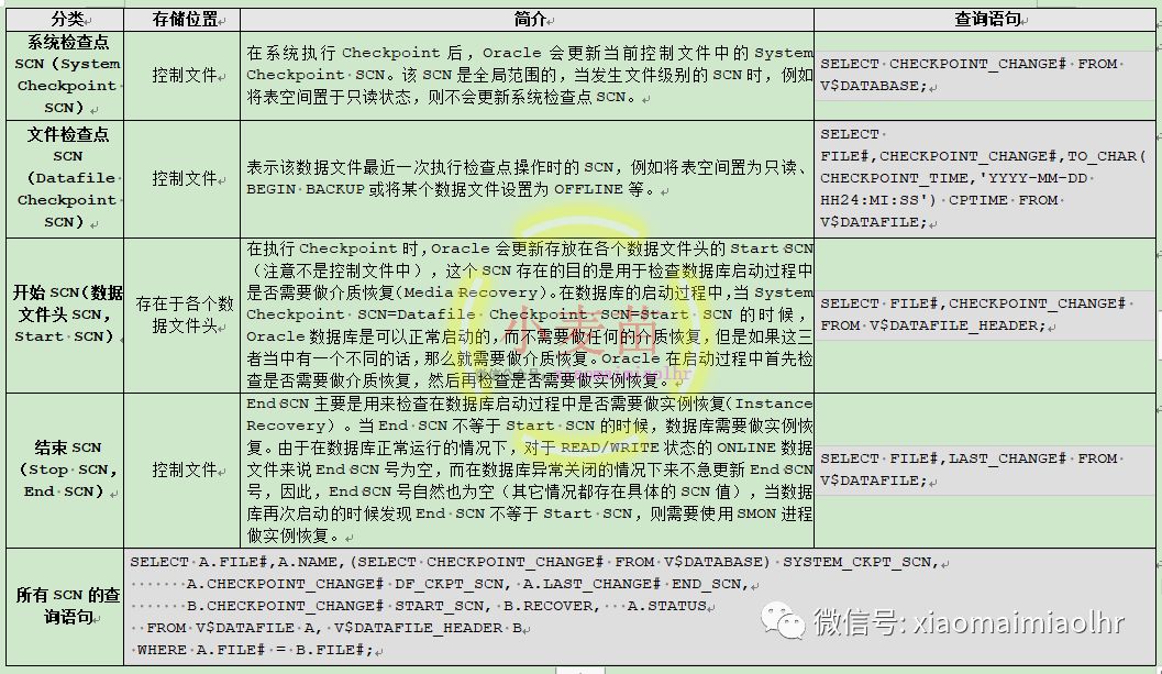 与Checkpoint相关的SCN可以分为4类,系统检查点SCN(System Checkpoint SCN)、文件检查点SCN(Datafile Checkpoint SCN)、开始SCN(Start SCN)和结束SCN(Stop SCN),参考下表: