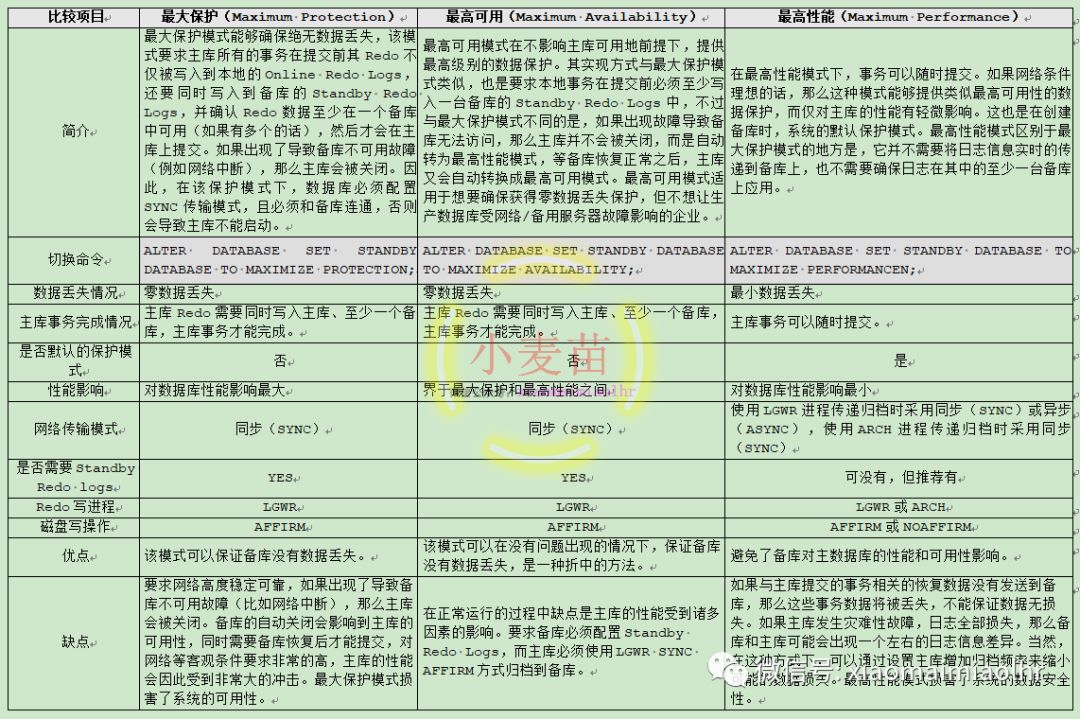 DG提供了3种数据保护模式(Protection Mode):最大保护(Maximum Protection)、最高性能(Maximum Performance)和最高可用(Maximum Availability),如下表所示: