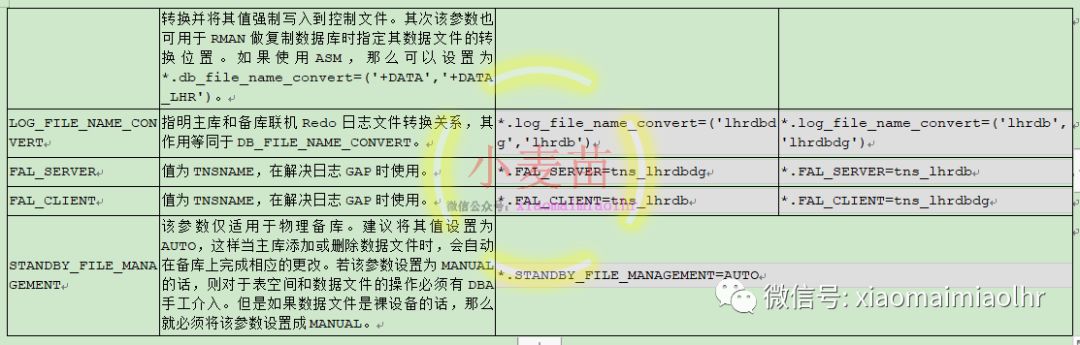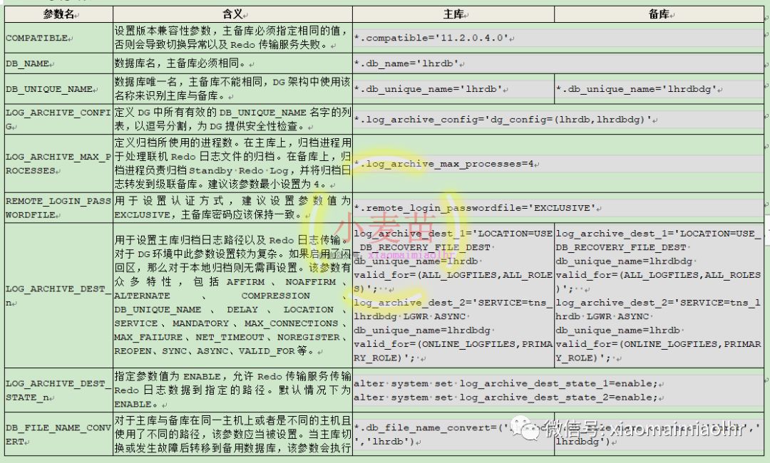 对于DG的配置,可以通过Grid Control来完成,也可以通过Data Guard Broker以及SQL*Plus来完成。对于前两者方式可以在图形界面上完成,操作简单。而对于使用SQL*Plus命令行方式,需要进行大量的配置,下表列出了一些重要参数: