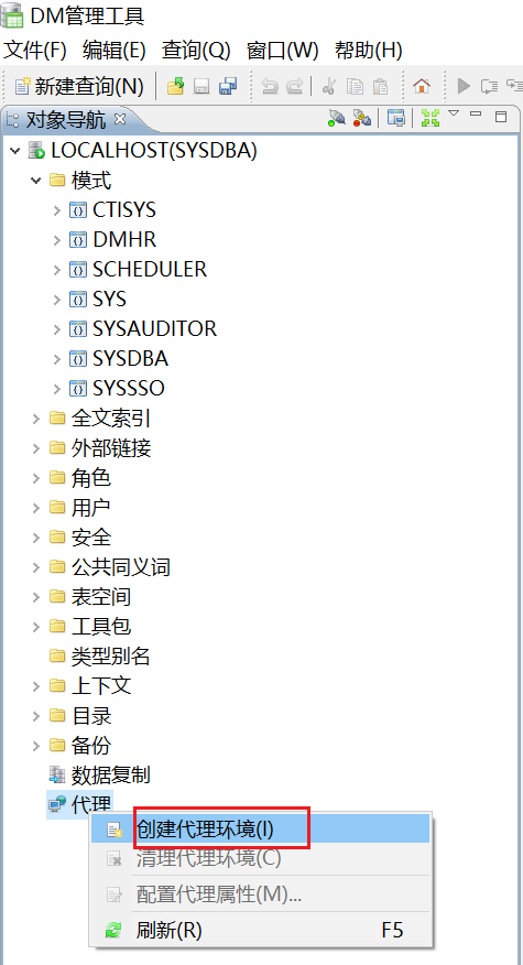 用SYSDBA用户登录DM管理工具,左侧“对象导航”窗口右击“代理”选项,选择“创建代理环境”。