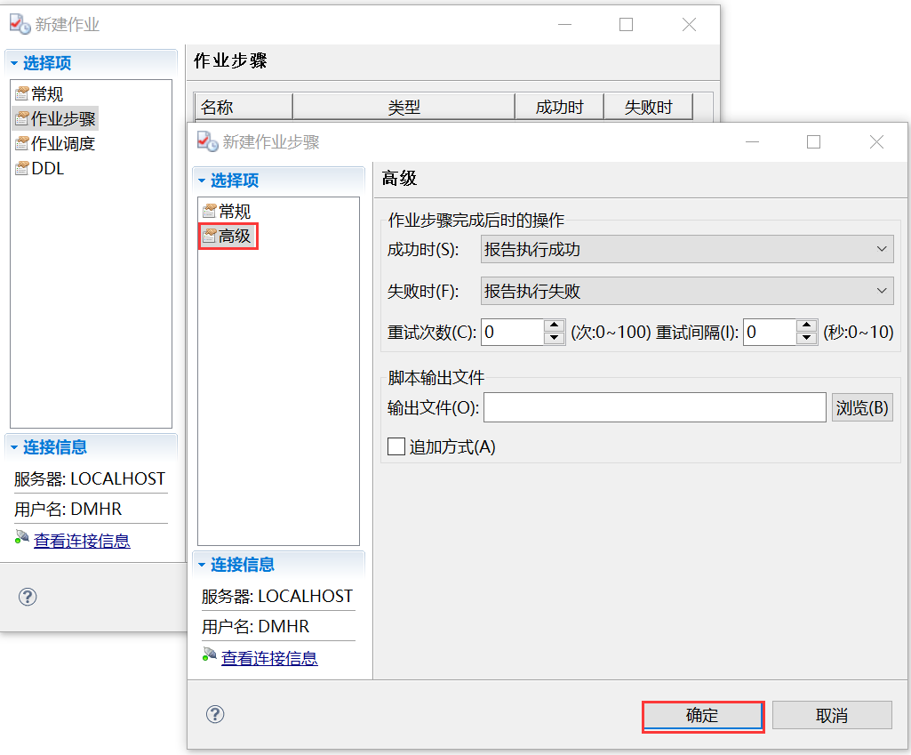 点击“高级”页签,可以配置作业步骤完成后的操作,可以选择执行下一步,也可以选择报告成功或失败,这里保持默认不变,点击【确定】。