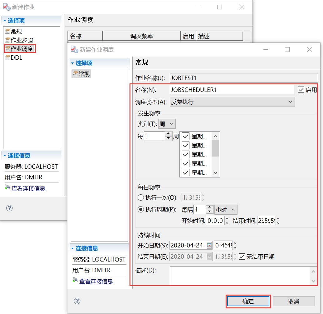 ③在新建作业页面,点击“作业调度”页签,选择“添加”,打开新建作业调度页面,填写名称、调度类型为反复执行,勾选星期一~周期日的选项,选择执行周期为每隔1小时,点击【确定】。